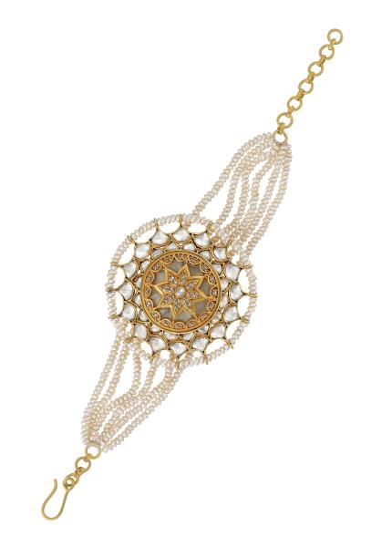 This design is exquisitely handcrafted out of silver with antique gold plating with vintage vibe, perfect for weddings and festivities. Intricately set with fine glass and pearls.