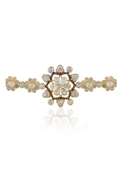 This mathapatti is exquisitely handcrafted out of silver with antique gold plating with vintage vibe, perfect for weddings and festivities. Intricately set with fine glass and pearls.